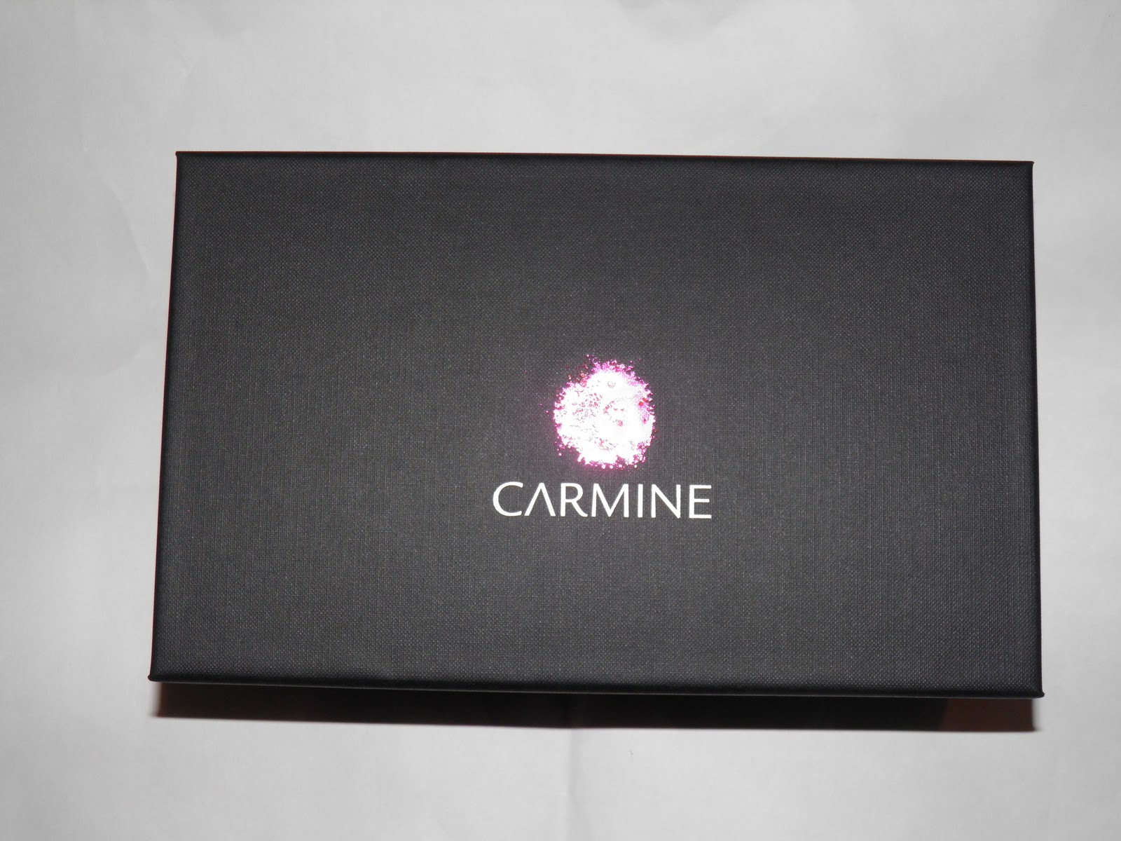this is how the box looks black with the carmine logo in the middle very sophisticated looking and the box feels strong so it can be re used for storage.